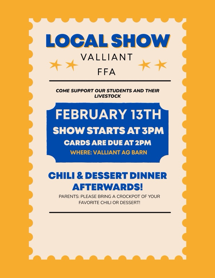 Valliant FFA Local Show 2026! Come support our students this Friday at 3pm!🧡
